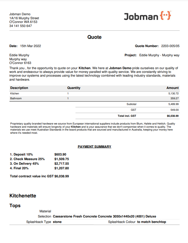 You can customize your quote Introduction and notes for this template allowing time-saving and correct terminology to be present at all times in your quotes.